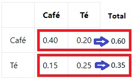 Imaginemos que realizamos una encuesta a un grupo de personas sobre sus hábitos de consumo de café y té. Queremos calcular la probabilidad de que una persona Tome café y té. La tabla de probabilidades sería la siguiente: