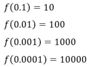 Consideremos la función f(x)=1/x y que queremos calcular su límite en 0, es decir,