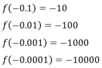Sin embargo, si x se aproxima por la izquierda de 0, f(x) toma valores muy pequeños: