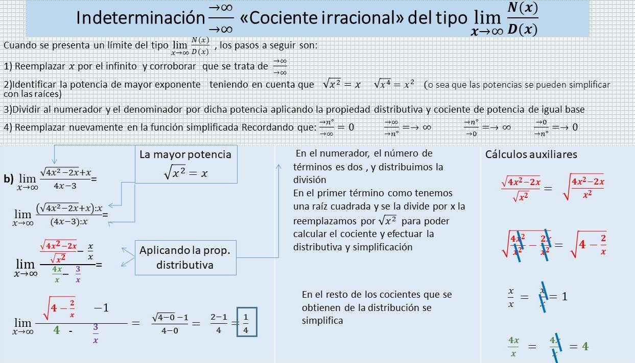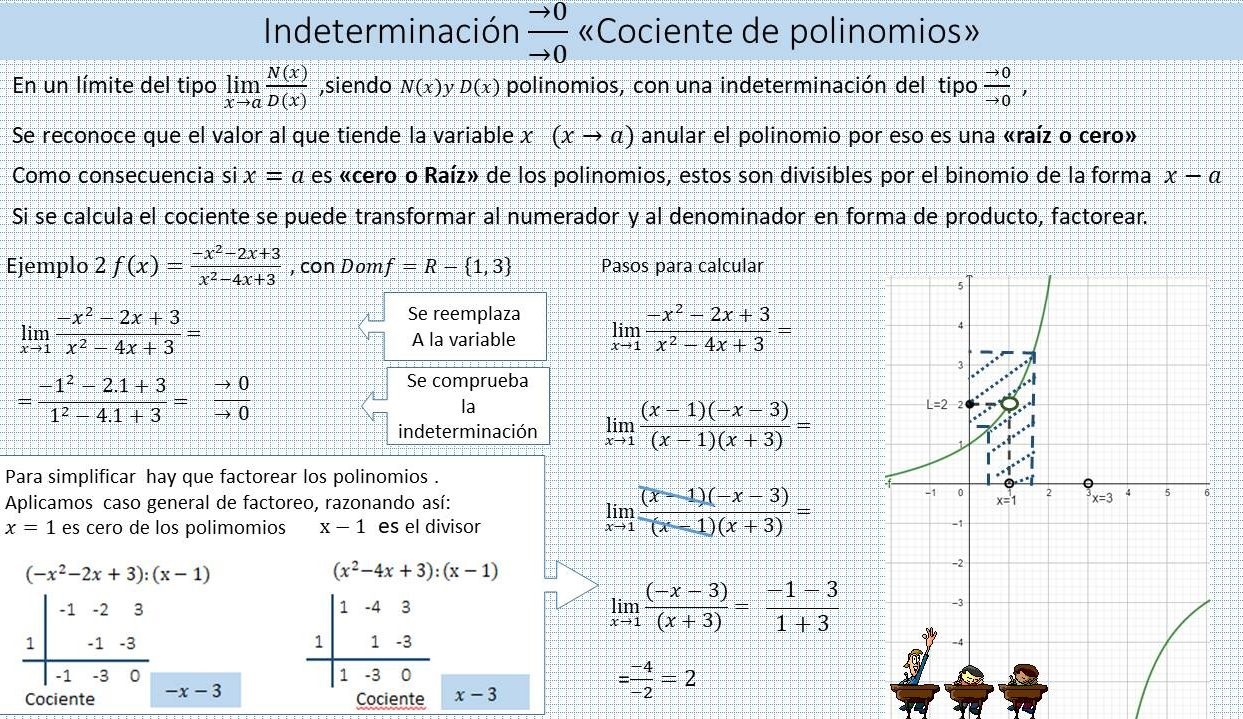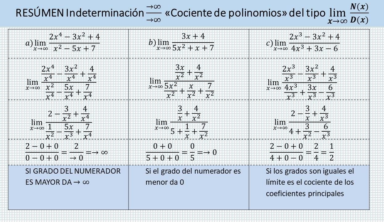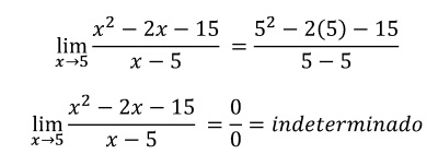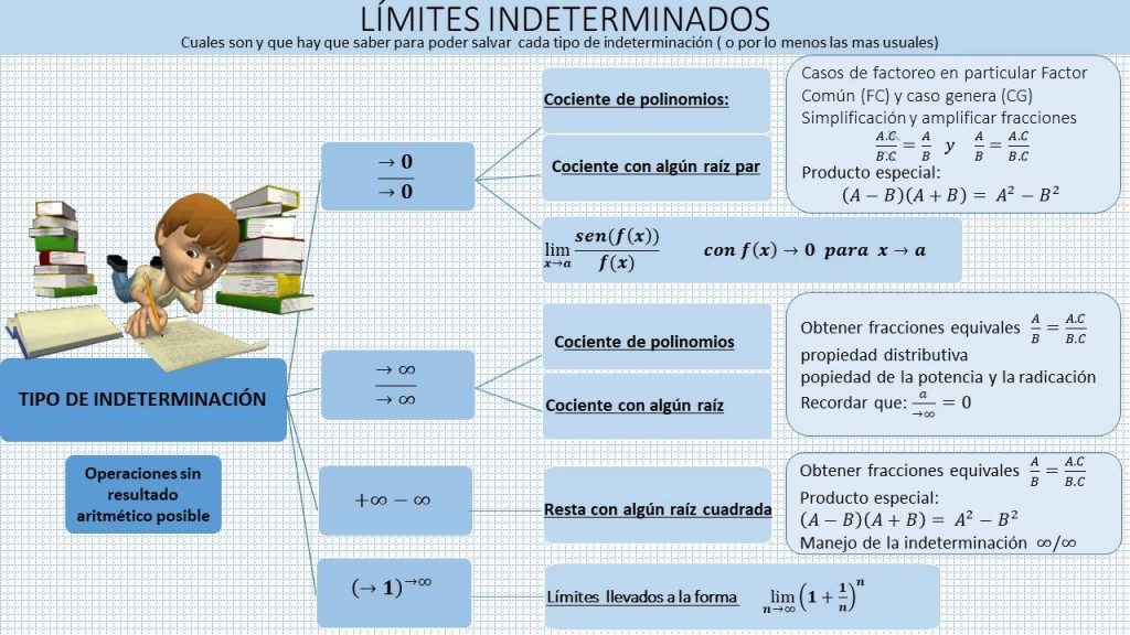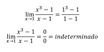 entre otras El resultado de estos límites no puede anticiparse y el mismo puede ser 0, ∞ ó un número finito diferente de cero, o bien puede no existir. Para resolverlos, se realizan procedimientos algebraicos adecuados que permitan salvar la indeterminación.
