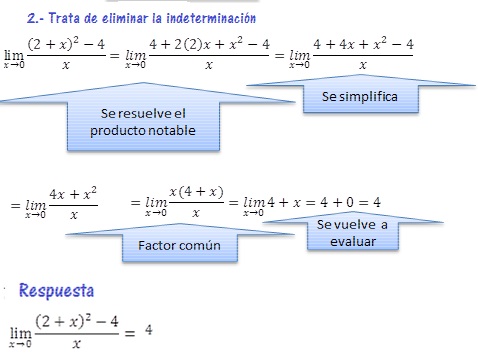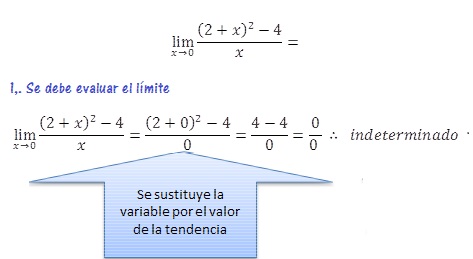 1.- Cuando el límite indeterminado es 0/0 y la tendencia es a cero, se realiza un factor común, como se muestra en el siguiente ejemplo:
