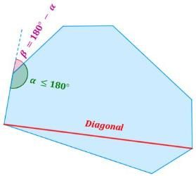 Todos sus ángulos internos son menores (o iguales) a 180°. (La suma de los ángulos internos de un polígono convexo se halla con la fórmula de los ángulos internos de un polígono). Todas sus diagonales son internas al polígono en todos sus puntos.