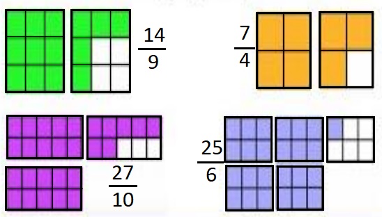 NOTA: Como el numerador es más grande copiamos la misma figura (con el número de casillas del denominador) tantas veces hasta llenar o completar el número dado en el numerador.