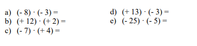 b) Multiplicación de números enteros de distinto signo: el producto de dos números enteros de distinto signo es un entero negativo, cuyo valor absoluto es igual al producto de los valores absolutos de los factores.