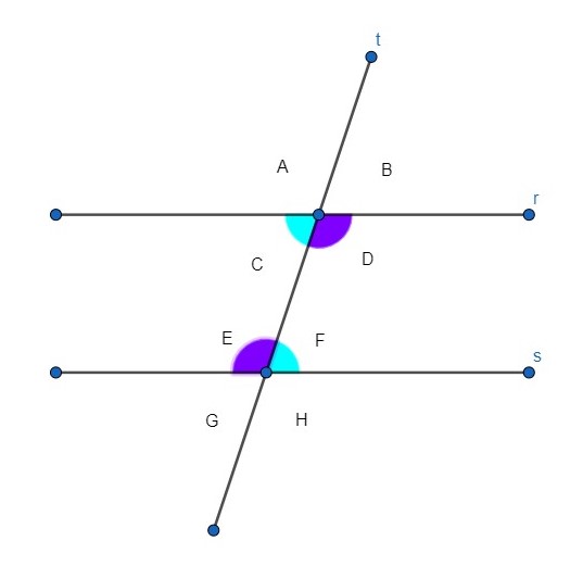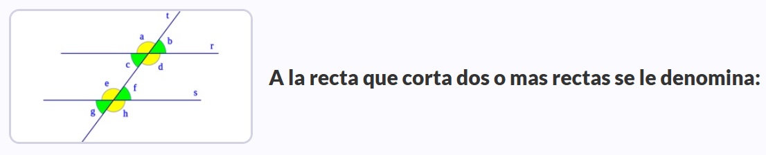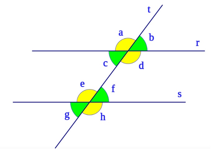 Dos rectas paralelas cortadas por una recta secante forman ocho ángulos, los cuales en la imagen están señalados por letras minúsculas: a, b, c, d, e, f, g, h