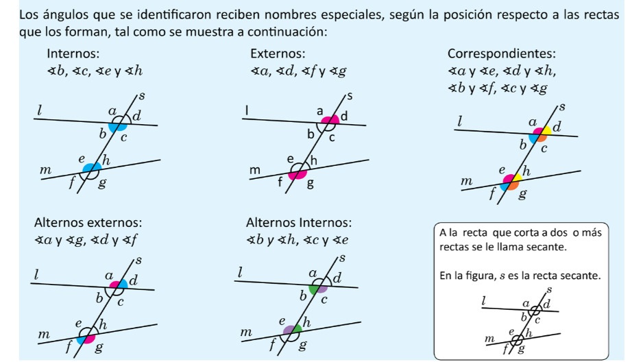 Estos, forman diferentes clases de ángulos, que se clasifican de acuerdo a las características que cumplan, de acuerdo a la posición que ocupen respecto a las rectas paralelas y a la recta secante. Estas son: