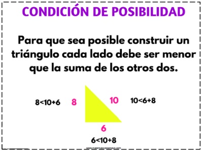 1. En un triángulo, la medida de uno de los lados es menor que la suma de los otros dos y mayor que la diferencia. (Condición de unicidad).