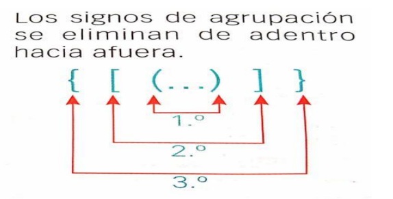 Para solucionar polinomios aritméticos con varios tipos de signos de agrupación; paréntesis(), corchetes [] o llaves {}, se va resolviendo de izquierda a derecha teniendo en cuenta el orden de las operaciones y el orden en que se van eliminando los signos de agrupación es de adentro hacia afuera : primero se realizan las operaciones que están entre paréntesis , luego los que están entre corchetes y por último las llaves , así :