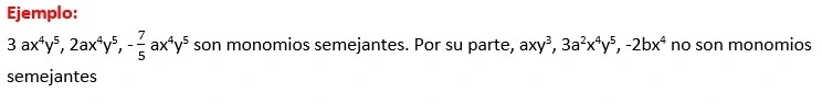 Si los monomios tienen la misma parte literal (Variables), se dice que son monomios semejantes. Por lo tanto, dos monomios semejantes solo se diferencian en los coeficientes.