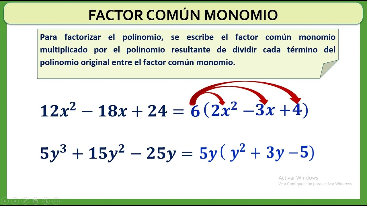Un factor común monomio, es el factor que está presente en cada término del polinomio. En el caso de los coeficientes numéricos el factor común es el mayor divisor posible entre ellos