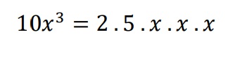 Para factorizar por completo 10𝑥3 , podemos escribir la factorización en primos de 10 como 2𝑥5 y escribir 𝑥3 , como 𝑥 . 𝑥 . 𝑥. Por lo tanto, esta es la factorización completa de 10𝑥 a la 3