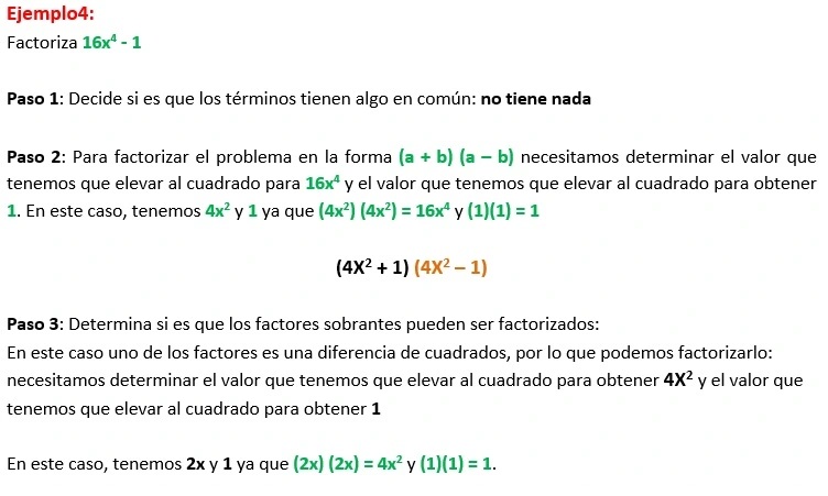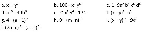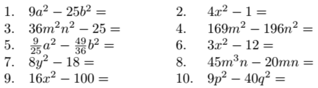 2. Realizar los siguientes ejercicios en el cuaderno utilizando el método de factorización de binomios para diferencia de cuadrados: