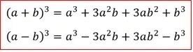 También llamado Un binomio al cubo o cubo de un binomio (suma) es igual al cubo del primero, más el triple del cuadrado del primero por el segundo, más el triple del primero por el cuadrado del segundo, más el cubo del segundo. Para la resta semintercalan los signos comenzando por el menos.