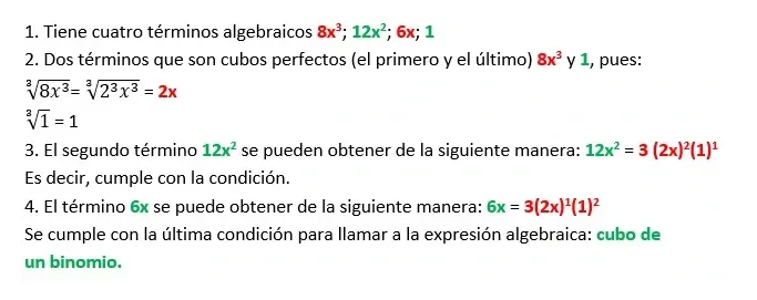 Paso1: Verificar si esta expresión cumple con las condiciones para ser considerada como cubo de un binomio: