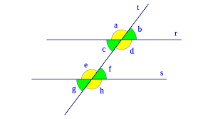 Dos rectas paralelas cortadas por una recta secante forman ocho ángulos, los cuales en la imagen están señalados por letras minúsculas: a, b, c, d, e, f, g, h