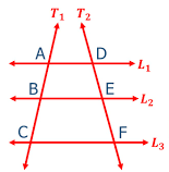 Si tres o más rectas paralelas (L) son cortadas por 2 o más secantes (T), la razón de las longitudes de los segmentos determinados en una de las paralelas es igual a la razón de las longitudes de los segmentos correspondientes determinados por las otras dos paralelas.